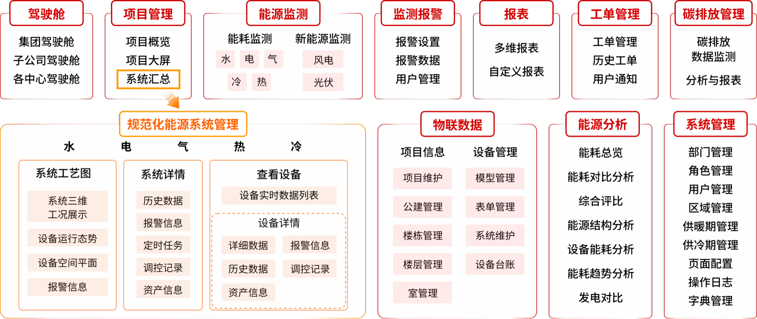 项目总体包括驾驶舱、气象数据、项目管理、能源管理、监测报警、系统管理6个一级功能模块,实现了对中心各类制冷系统以及能源设备进行能耗监测和自动化调控。