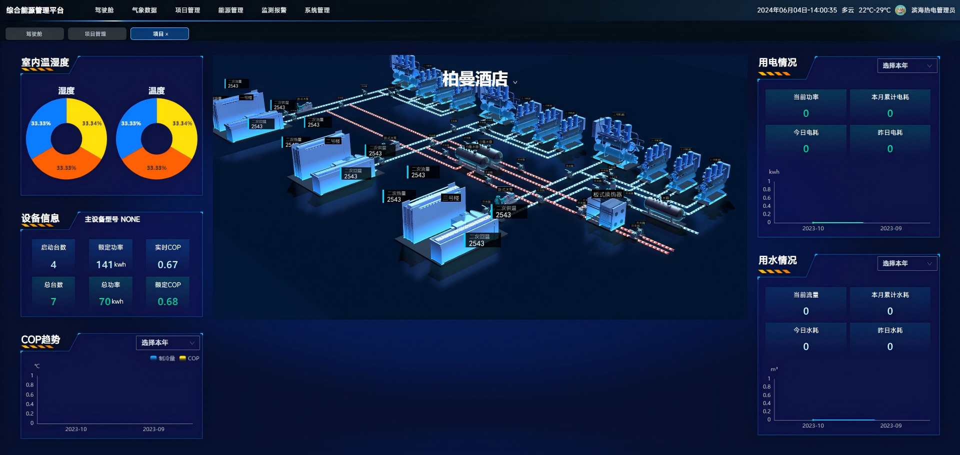 滨海一中心以柏曼酒店进行项目试点,现场有十台空气源热泵机组用于环境制冷,实现了对换热站以及空气源热泵实现能耗监测及设备管理。